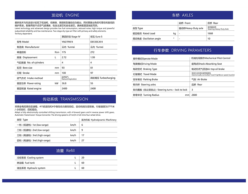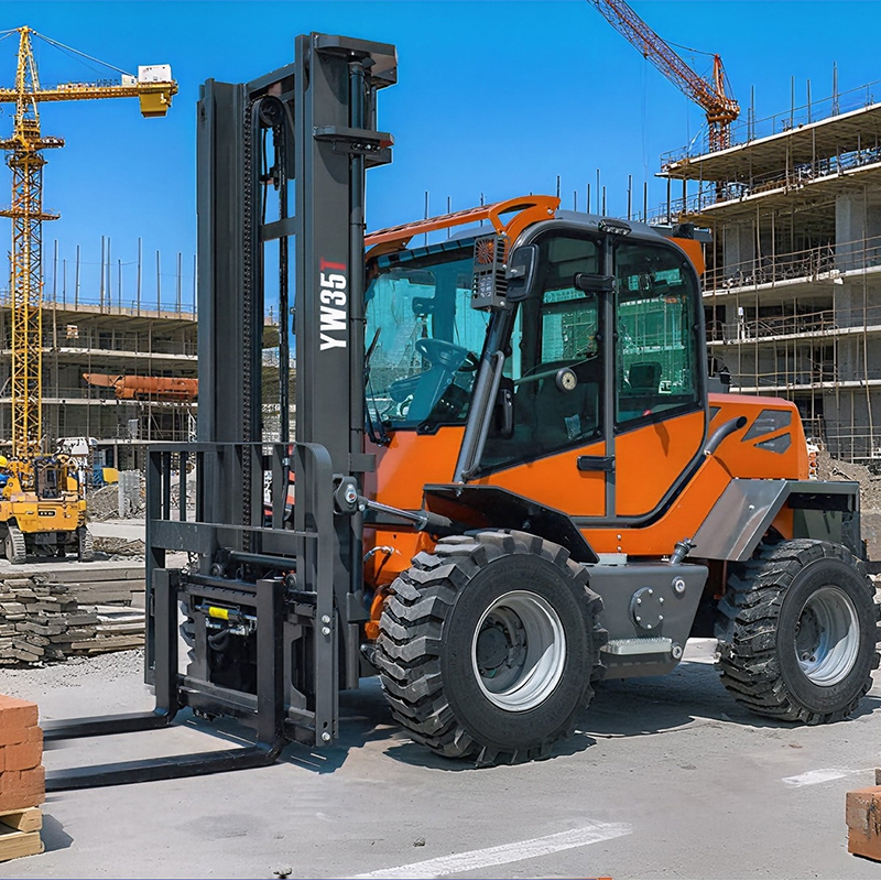 一體式越野叉車(YW35T)為加厚貨叉,精選鋼材提升載重,前輪20.5半實心輪胎,后輪12-16.5真空鋼絲輪胎,后輪轉向,承載 力和脫困能力更強,軸距短,一體式車架,無鉸接,轉彎半徑小,轉向角度大,更適合狹小 空間作業,加裝安全示寬警示燈,保證夜間安全距離作業,發動機后機蓋可向上開啟,更換濾芯更容易,后方擋泥板承載力強,可 供保養人員站立。